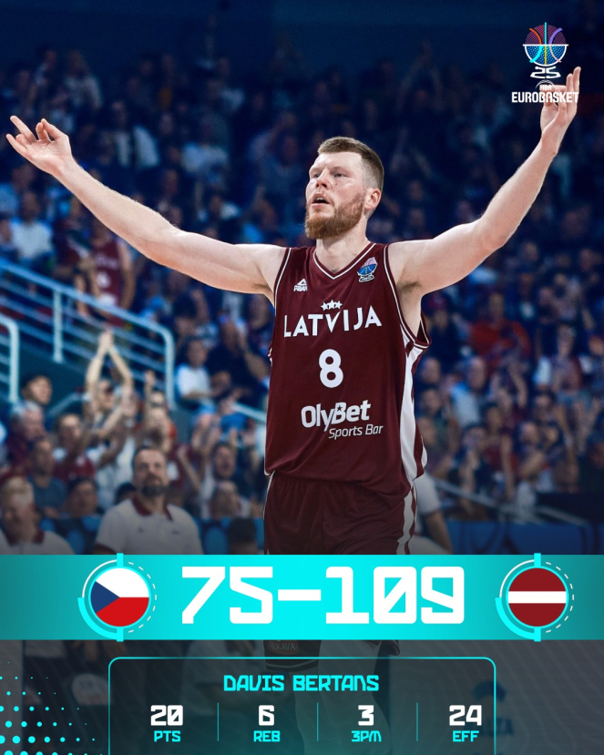 Еще до последних матчей сборная Латвии обеспечила себе 3-е место в группе A и выход в 1/8 финала, а чехи выбыли из турнира. Соперники сборной Латвии в 1/8 финала станут известны поздно вечером в среду после последнего матча в группе B в Тампере. Самыми результативными в составе сборной Латвии стали братья Бертансы — оба набрали по 20 очков, хотя и по-разному. Дайрис все свои броски с игры реализовал из-за дуги (6 из 10 попыток), Давис же тоже показал высокую точность издалека (3 точных трехочковых из 6), но также успешно атаковал из-под кольца. Дайрис также отметился 4 точными передачами, Давис — 6 подборами (один из них на чужом щите). Еще по 16 очков набрали Роланд Шмитс и звезда НБА Кристап Порзиньгис, сделавший также 7 подборов, 3 результативные передачи и 2 блок-шота. Также 12 очков набрал Артур Куруц. 03-09-2025