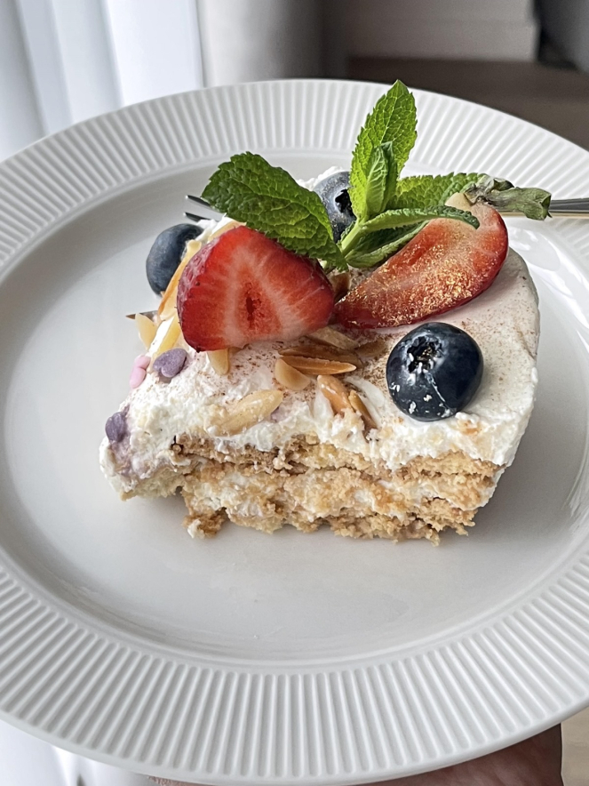 Ингредиенты Песочное печенье — 300 г Творог (жирный, не сухой) — 400 г Сметана — 150 г Сахар — 3–4 ст. л. (по вкусу) Ванильный сахар — 1 ч. л. Какао-порошок — 1–2 ст. л. (по желанию) Шоколад или орехи — для украшения; Молоко — 100 мл (для пропитки печенья) Приготовление: В глубокой миске соединить творог, сметану, сахар и ванильный сахар. Взбить массу блендером до кремовой консистенции. При желании добавить какао — получится шоколадный вариант. Подготовить форму или просто разъёмное кольцо на тарелке. Печенье быстро обмакнуть в молоко и выложить первый слой в форму. Сверху распределить часть творожного крема. Повторять слои, пока не закончатся ингредиенты, завершив торт слоем крема. Украсить тертым шоколадом, орехами или кокосовой стружкой. Накрыть плёнкой и убрать в холодильник минимум на 4 часа, а лучше на ночь. Текст и фото: @hudejkaa в Инстаграме31-05-2025