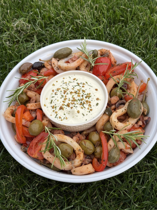 Ингредиенты: морепродукты (кальмары кольцами, щупальца, креветки) – 300–400 г сладкий перец – 1 шт. лук-шалот – 1 шт. чеснок – 1 зубчик черри – горсть оливки без косточек – по вкусу оливковое масло – 1 ст. л. соль, перец – по вкусу паприка копчёная – ½ ч. л. сухие итальянские травы – ½ ч. л. песто – 1 ч. л. (по желанию, для акцента) Для соуса:натуральный йогурт – 2 ст. л.творожный сыр – 1 ст. л. горчица – ½ ч. л. сок лимона или лайма – немного соль, перец – по вкусу Готовим 1. Морепродукты размораживаем (если были заморожены), аккуратно обсушиваем. 2. Разогреваем сковородку с оливковым маслом, обжариваем мелко нарезанный шалот и чеснок до аромата — но без угля, мы не на шашлыках. 3. Добавляем морепродукты, быстро обжариваем на сильном огне (3–4 минуты). Главное — не передержать, иначе получится резиновое шоу. 4. Нарезаем перец полосками, черри — пополам, оливки — кружочками. 5. Добавляем к морепродуктам. Обжариваем ещё 2–3 минуты. Приправляем солью, перцем, паприкой и итальянскими травами. Если хочется — добавь ложку песто для яркости Соус В мисочке смешиваем: – йогурт – творожный сыр – горчицу – сок лайма/лимона – соль, перец Размешиваем до кремовой консистенции. Попробовали? Если вкусно — не трогаем больше Подача На тарелку — горка морепродуктов с овощами, рядом — ложка соуса. Можно украсить зеленью или сбрызнуть ещё каплей оливкового масла. Текст и фото: @hudejkaa в Инстаграме18-09-2025