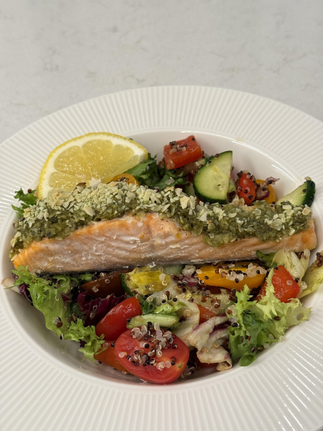 Ингредиенты: Для лосося: • филе лосося — 2 куска • песто — 2 ст. л. • миндальные лепестки — 1 ст. л. • лимонный сок — 1 ч. л. • соль, перец — по вкусу Для гарнира: • киноа — 100 г (сухая) • овощи (огурец, черри, перец, кабачок или запечённые — на выбор) • свежая зелень Заправка (вариант вкусный и нескучный): • оливковое масло — 2 ст. л. • соевый соус — 1 ст. л. • гранатовый соус (наршарап) — 1 ч. л. • горчица — 0,5 ч. л. • мёд — 0,5 ч. л. • свежемолотый перец Готовим: 1. Лосось сбрызгиваем лимоном, солим, перчим. 2. Смешиваем песто с миндалём, выкладываем «шапочку» сверху. 3. Запекаем при 190 °C 15–18 минут. 4. Киноа отвариваем. Овощи можно взять свежие или запечь. 5. Смешиваем овощи с киноа и поливаем заправкой. 6. Собираем тарелку: гарнир + лосось в зелёной шапочке. Красиво и легко. Подача: ещё немного зелени, долька лимона и микрозелень сверху — и блюдо выглядит как будто из меню ресторана, но без ресторанного счёта. Текст и фото: @hudejkaa в Инстаграме27-11-2025
