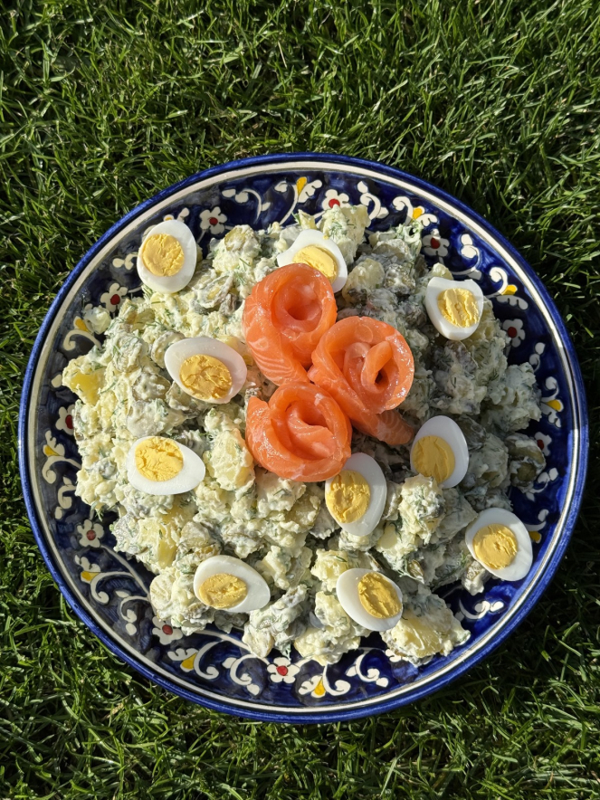 Тёплый картофельный салат с йогуртовой заправкой и лососем